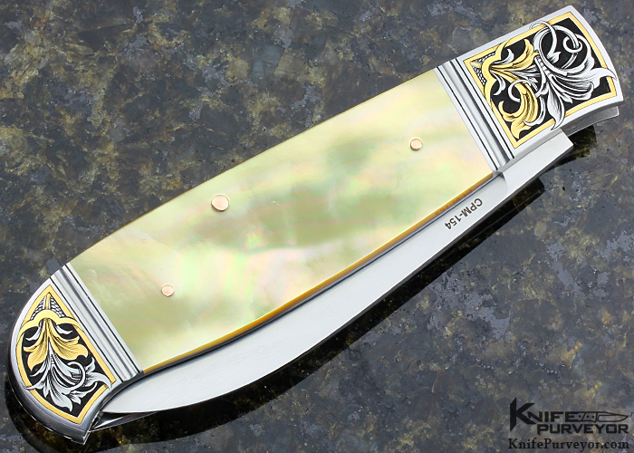 The Gold Lip Pearl Scales on this piece from Warren Osborne are easily among the nicest we've seen. The Engraving And 24kt Gold Inlay is beautiful. The blades have been finished to a low mirror polish. The action is very smooth. A wonderful Slipjoint from Warren.