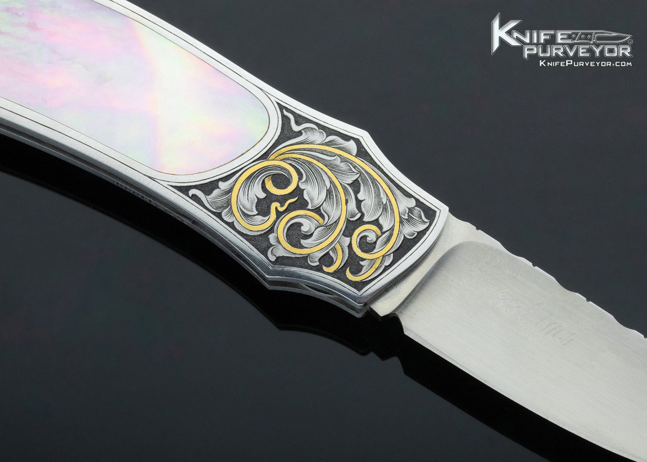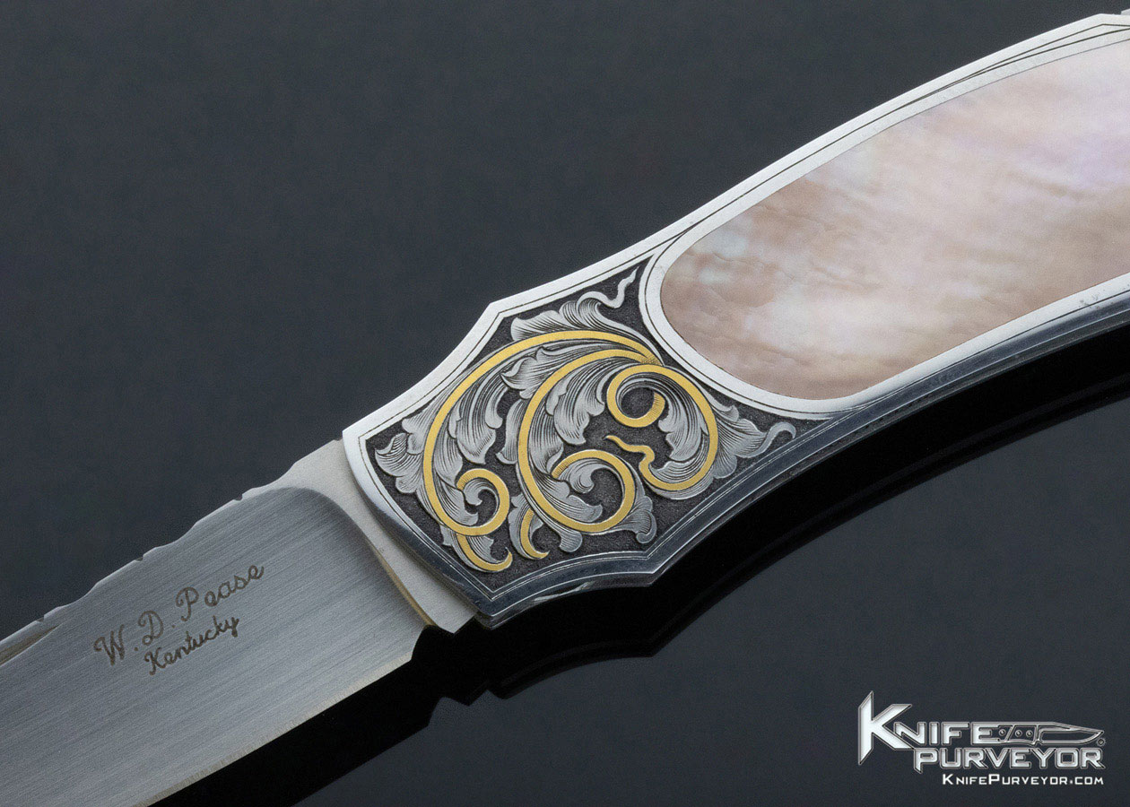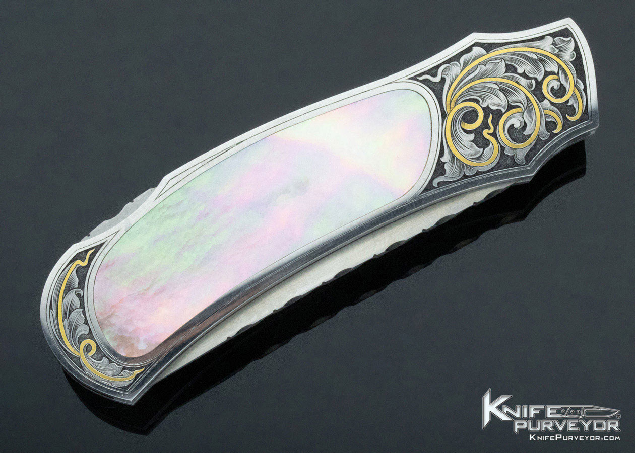 W.D. Pease Custom Knife Black Lip Tahitian Pearl Interframe Lockback Engraved by Mark Waldrop