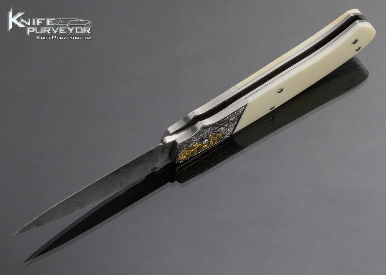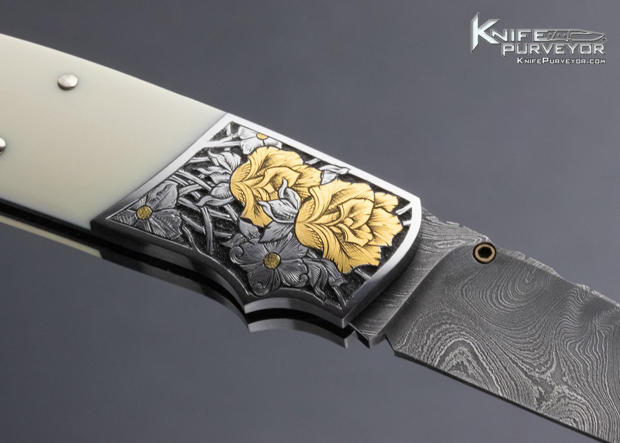 W.D. Pease Custom Knife Damascus Fossilized Walrus Side Lock Folder Engraved by Gil Rudolph