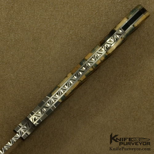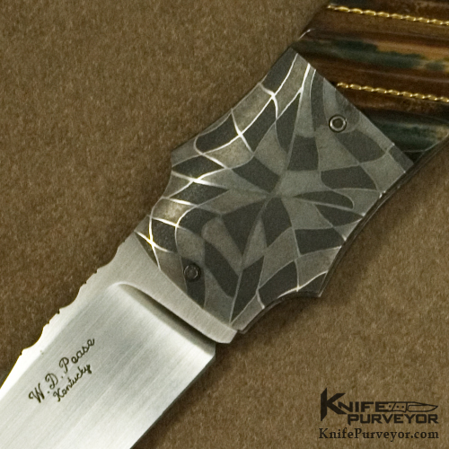 This lockback dagger was made by W.D. Pease. It features Robert Eggerling mosaic Damascus bolsters and a hand rubbed satin finished ATS-34 blade. The scales are fluted mammoth ivory with 24Kt Gold braided wire spacers. The knife is finished with W.D. Pease's signature filework.
