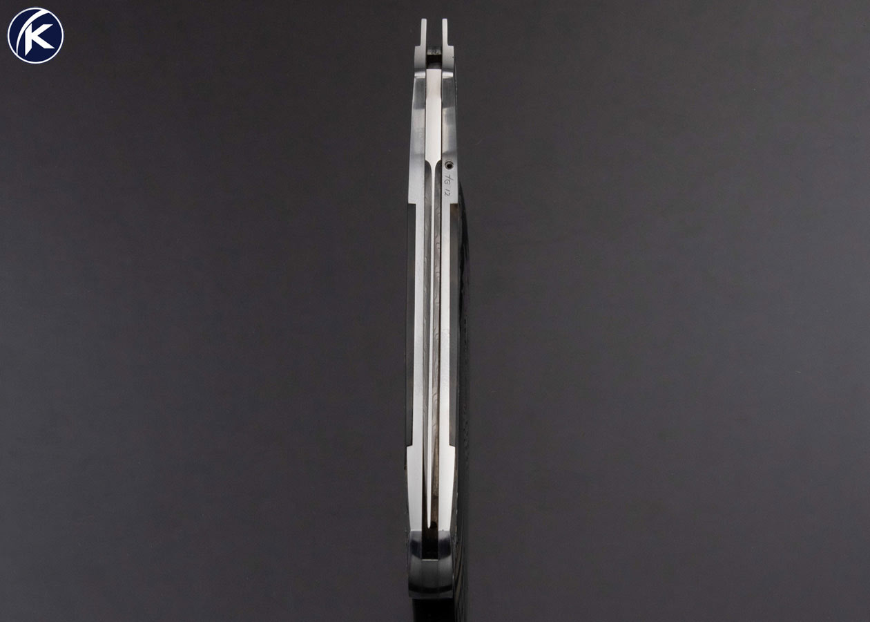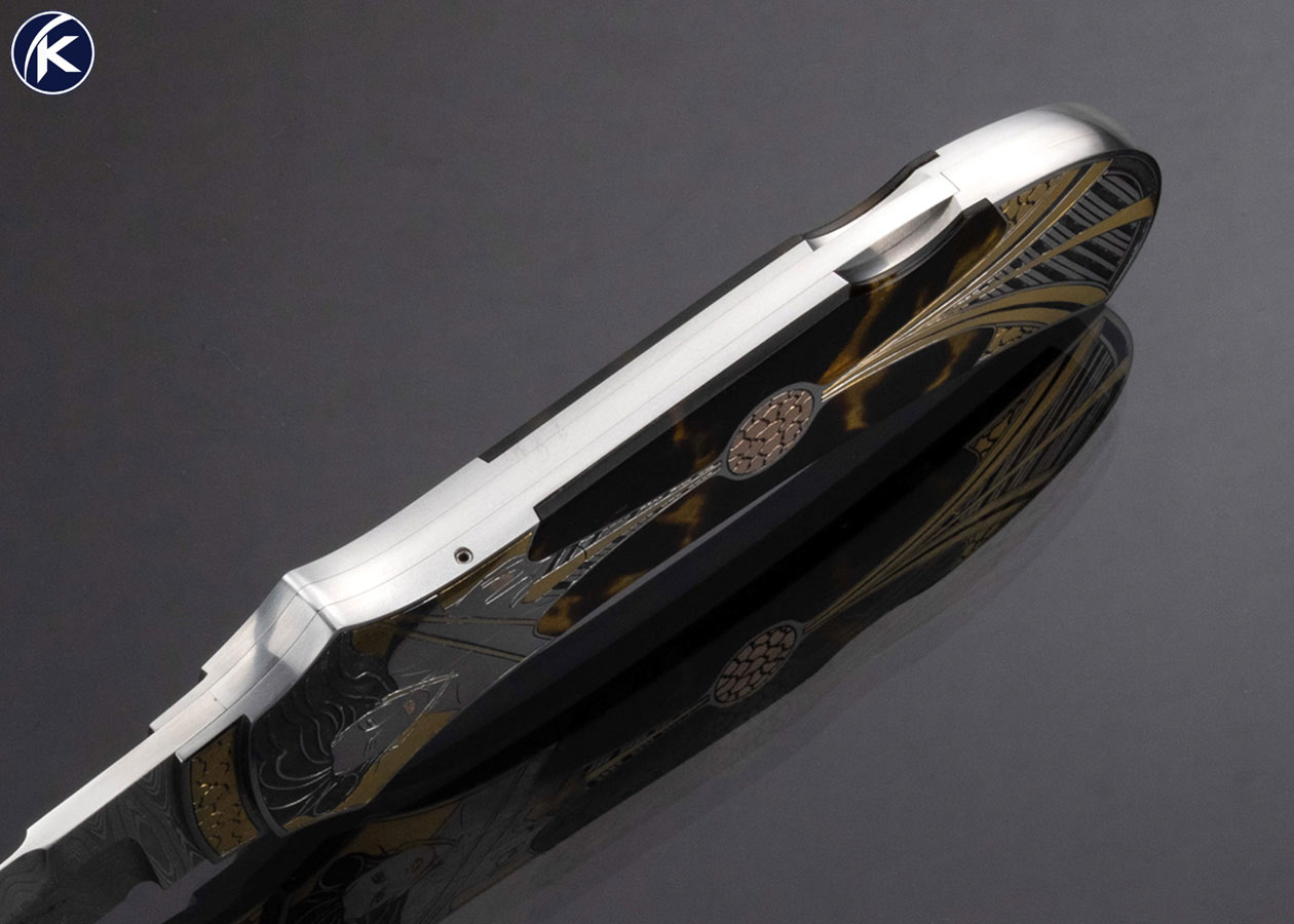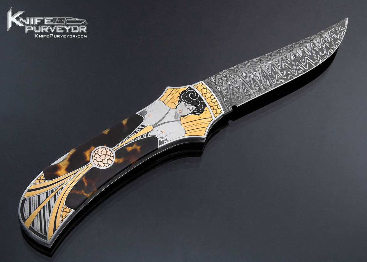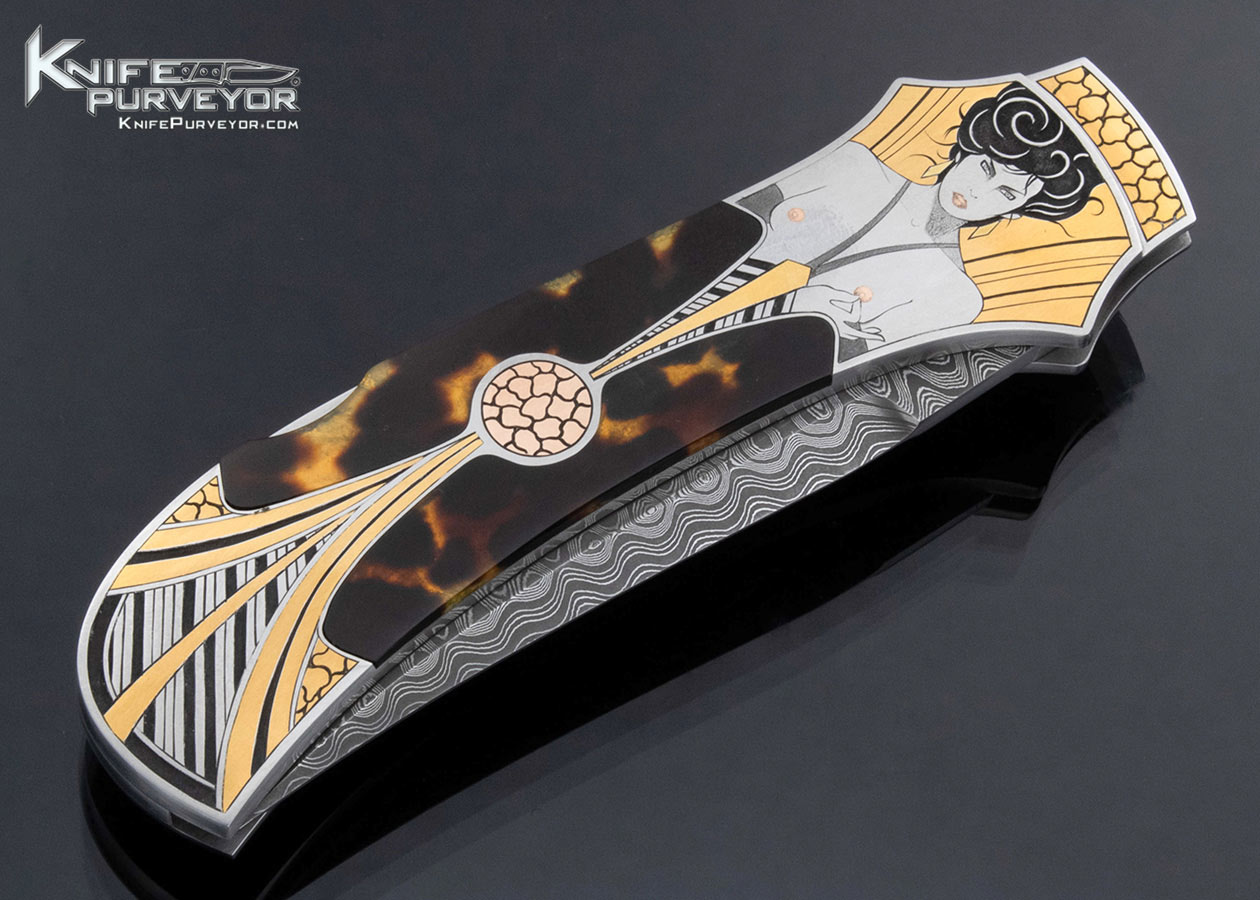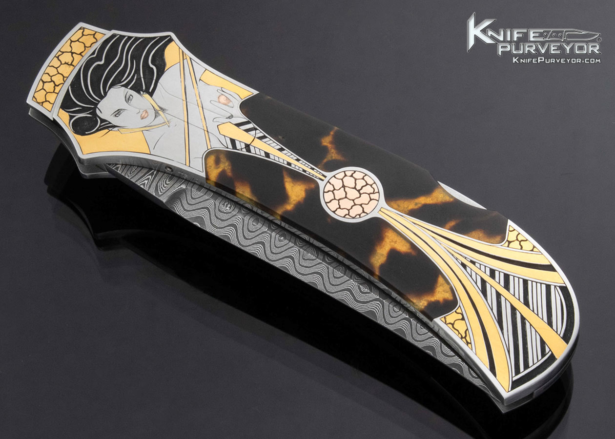 Warren Osborne Custom Knife Stainless Damascus Amber Semi Automatic Lockback Engraved by Tim George
