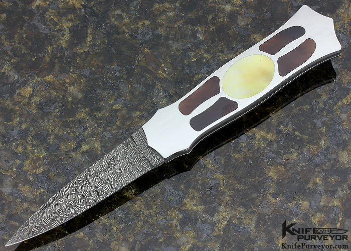 Warren Osborne Custom Knife #001 Damascus Lockback Dagger w/ Amber & Gold Lip Pearl Inlays